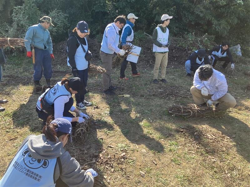 当日は、少し寒いと感じた風も作業中には、かえって心地よい風となり青空ものぞく過ごしやすい一日となり、当社は他の参加者とともに、土壌手当として草撒き作業や粗朶づくりをしました。